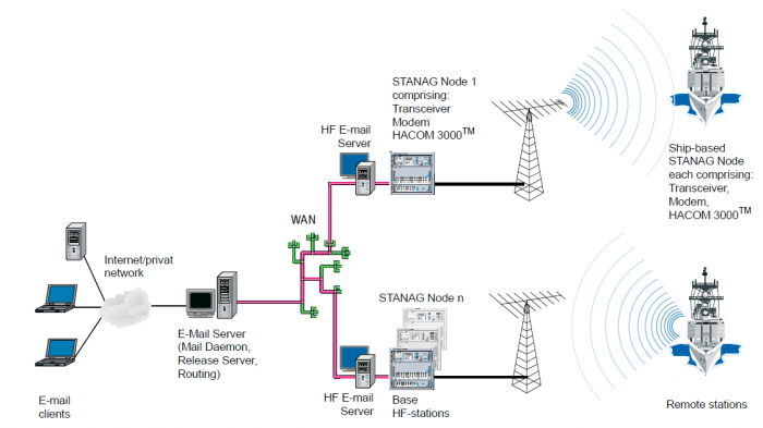 The Hagenuk HF e-mail communication system SEICAM 2020E has been designed to deliver data messages fast and error free via existing HF radio equipment, using the proven military standard waveforms of the HF Series 3000 modem MDM 3000 E. The system has been designed especially for applications where an individual or group needs Internet e-mail connectivity, but has no means to access a conventional Internet socket. The SEICAM 2020E software can be configured to serve as a base station with the appropriate local mail server and Internet interface or as a remote station without Internet connectivity whereas both stations may be equipped with identical hardware. The base station mail server collects, sends and receives mails from the Internet/WAN and/or other local clients for relaying the messages via HF radio link to and from the remote station, i.e. between the distant mail servers. SEICAM 2020E allows the use of different mail programs such as MS Outlook or Mozilla Thunderbird.